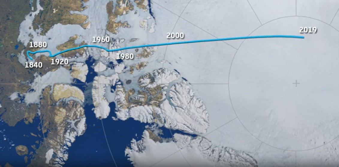 Sự dịch chuyển của cực Bắc từ năm 1840 đến năm 2019. Ảnh: ESA