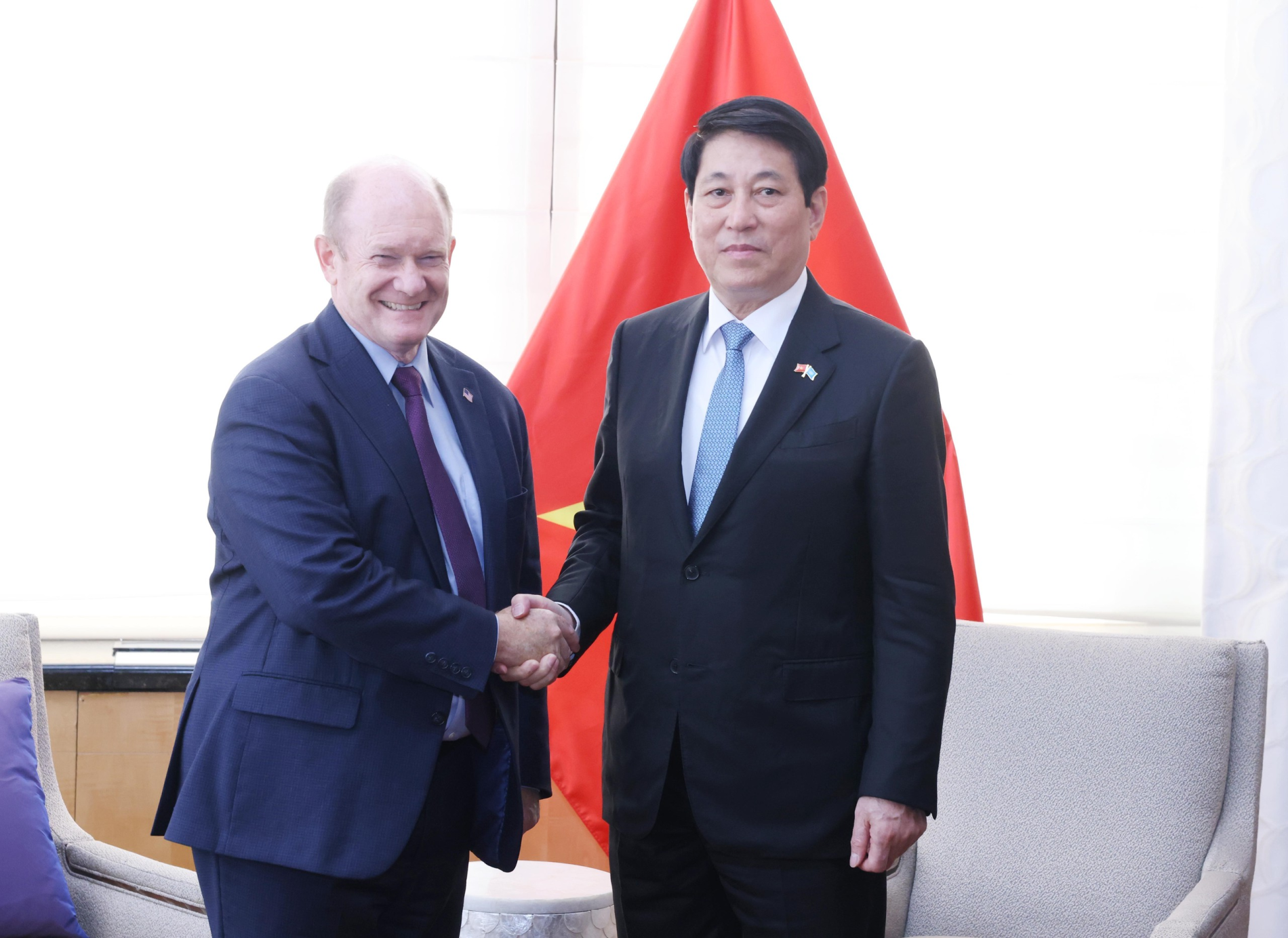 Tiếp Thượng nghị sĩ Chris Coons, Chủ tịch nước đề nghị tăng cường trao đổi đoàn, thúc đẩy thương mại – đầu tư, đồng thời mở rộng hợp tác giữa các địa phương Việt Nam và bang Delaware trong các lĩnh vực công nghệ sinh học, nông nghiệp công nghệ cao, năng lượng tái tạo. Thượng nghị sĩ Chris Coons khẳng định Thượng viện Mỹ sẽ tiếp tục ủng hộ triển khai quan hệ Đối tác chiến lược toàn diện, chú trọng hợp tác khắc phục hậu quả chiến tranh, giáo dục – đào tạo, trong đó có vai trò của Đại học Fulbright Việt Nam.