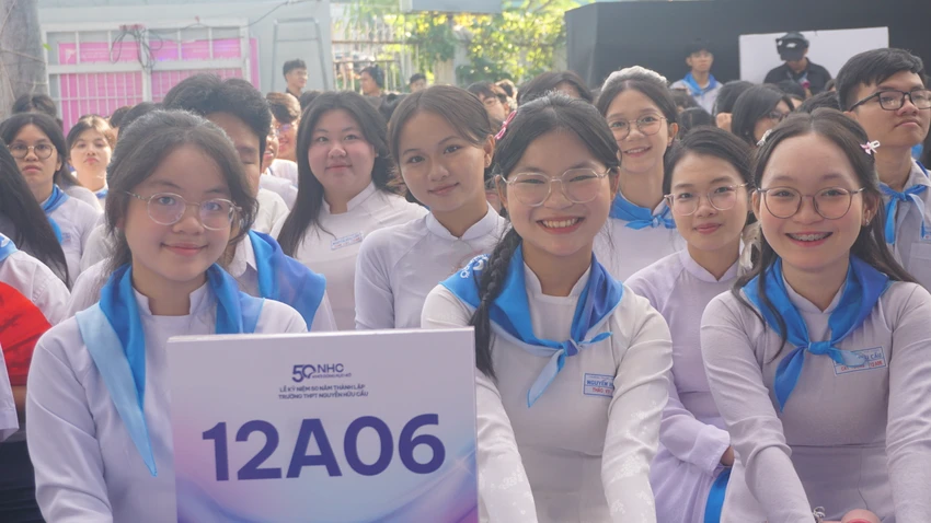 Học sinh Trường THPT Nguyễn Hữu Cầu, xã Bà Điểm trong lễ kỷ niệm thành lập trường. Ảnh minh hoạ: NGUYỄN QUYÊN/plo